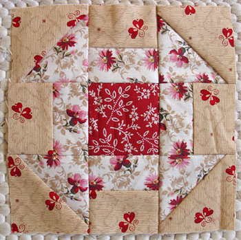Oooh, I love this one! This, the latest block for my civil war sampler, is also from Barbara Brackman's Facts and Fabrications: Unraveling the History of Quilts and Slavery and is called Beauregard Surrounded. The block is traditionally called Burgoyne Surrounded after the defeat of a British general during the Revolutionary War. Brackman has renamed it to recall the Civil War, more specifically the defeat of Confederate general Beauregard at the Siege of Corinth in 1862. Beauregard, who was actually the general who commanded the forces that fired the first shots of the Civil War at Ft. Sumter in South Carolina, was surrounded in Corith, Mississippi and outnumbered 2 to 1 by Union forces. He eventually chose to evacuate the city and snuck his troops out on the trains that should have been sending reinforcements.