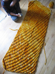 Yes, I've succumbed and have started a Clapotis. This is very surprising to me, as although I do love the design, I am totally not a shawl or scarf person. But I'm going to a wedding in the fall where I need to wear a fancy little dress and will actually need a lovely little something to keep my bare shoulders warm. And what a perfect excuse to try out that new Malabrigo merino! I'm one skein in and it's as soft as a pillow. And no pilling or felting to report so far - but I have been warned by several people that this yarn is so soft it does tend to felt and pill. Given this tendency, I thought that a shawl might be a better way to use this yarn than in something like an everyday sweater or mittens. So I picked up my favorite colorway, the incredible Sunset that caught my eye when I first saw this yarn. And look at how pretty it is with the very first dropped stitches.