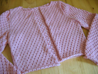 The stresses of twelve days of rain, a cold/stomach bug working it's way through the family, and hubby away on a business trip sent me running to my crinkle cardigan for comfort many times in the last two weeks. Now hubby's back, it's finally stopped raining, there's only one runny nose left to suffer through and I've got two finished sleeves and the beginnings of a front panel. Just a few more crazy weeks like that and I should be all done with this cardi!