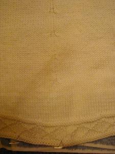Elizabeth is all sewn up and the neckband is finished, but she still has some minor problems. Before I get into that though, let me say that the sweater fits incredibly well, feels absolutely wonderful on and I totally love it! I've washed it and it's blocking now, so you'll have to wait until tomorrow for pictures. I must thank Melissa, who was also finishing up a frogged and reknitted sweater this weekend, for her encouragement. I am so proud that I had the courage to rip this sweater out and reknit it and then that I got all the math right when readjusting for gauge and size! So, now that the self-congratulation moment is over, on to the problems. And I really, really need your help here, since I'm going to have to venture into unchartered territory to fix 'em!