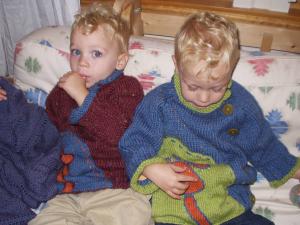 The boys were tumbling about on the sofa while I was inspecting the giranimals jacket, and I was amazed at how much they've grown since I knitted these up. When I finished the first giranimals jacket, it was huge on B, but now it'll fit perfectly. I'd better get this finished fast before they grow even more!