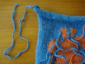 I forgot the best part of my new shiny happy knitting karma. Remember how I was worried that after ripping out the giranimals pocket and losing some yarn to snags, I wouldn't have enough left over to redo the pocket? Well, after binding off the last row, this is what I had left!