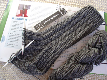 The yarn is Yarn for Sox, a good sturdy wool/nylon blend. It's a bit scratchy, but hubby likes to wear his winter socks over thinner ones, so it's all about the warmth. I've made socks for hubby with this yarn before and he's liked them, so I picked this and another color up at a Wild & Wooly sale a couple of years ago when I spotted it. Pretty much all of hubby's socks are 3x1 rib - I can't even imagine making another pattern on his socks! - so all I needed was Ann Budd's Knitter's Handy Book of Patterns for the numbers and I was off. The yarn knits up fast on US8's!