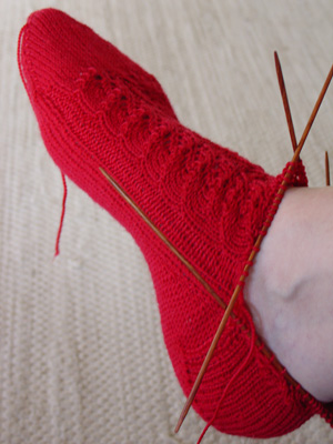 Sometimes you see a pattern and you just can't imagine making it in any other color than the designer used in the sample. Even though I've seen many very pretty Baudelaire socks on Ravelry, I was so struck by Cookie A.'s original red ones that I had to make mine red. It helps that I like red. A lot. And that I had some Cherry Tree Hill Supersock in a delicious red in the stash.