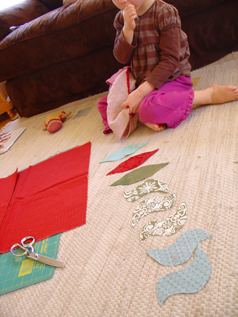 This morning wee helped me cut out pieces to sew up a few bird ornaments from Last-Minute Patchwork + Quilted Gifts .