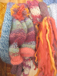 So before they started talking to Michael Moore, I gave them a day off from holiday knitting and let them have some fun. They made a pompom for my funky handspun hat.