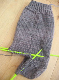 I finished the first one last night, but still have to kitchener up the toe. I think I've overestimated the recipient's foot size, so I'll probably rip out the toe and go back an inch before reknitting it. I want these to be really nice. They are a holiday thank you gift for a friend of my mom's who always sends the boys great Xmas gifts, even though he's never even met them. Almost every gift he's sent is something the boys love and use everyday - some cool chairs, fun umbrellas, their favorite puzzles, the comforters on their beds...