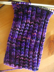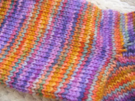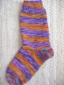 It's Koigu Kersti in gorgeous purple and orange shades (color #121). I wouldn't have ever picked out these colors for myself, but now that I'm knitting with it, even I, anti-variegation girl, have started coveting this sock. The colors are so bright and complement each other so well.