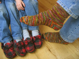 The boys love their new slippers too. Can you tell? They're sitting in their new favorite chair, the Ikea Lomsk chair. They were so excited about the chair they even wanted to help daddy put it together. Good tip on drill use from my son S. (especially for all of us planning on making those Knitty Gritty knit boots):