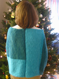 On Christmas Eve, I pulled out the poncho, took some measurements and realized that the two rectangles of the poncho could be resewn together to make one long rectangle approximately the size of the Knitorama shrug. So, I took apart all the seams, then reseamed it and stitched together armholes. I nixed the buttons, as my shrug doesn't have the exact same proportions as the pattern calls for and would be too constricting if it was closed (picture Tyrannosaurus Rex arms and you'll get the idea). But even without the buttons, it stays on just as well as any shawl would. And check out how those blue stripes came together in the back.
