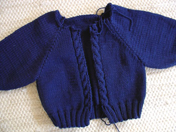 George is done! All the finishing touches on this sweater - the cables, the pockets, that cool collar - were so worth it. In fact, they add so much to the sweater that I was really afraid to use buttons with any sort of contrast for fear of overpowering them. As I tried different buttons, that deep navy color just keep fading away as background, setting off whatever I put on top of it. No more cables - it's a button! I was lucky to finally find buttons in almost the same navy shade as the sweater itself and I think they're perfect. And I have to say that it was wonderful to use the Rowan handknit dk cotton again. I'd forgotten how good a good cotton can be. And how good a good boy sweater can be.