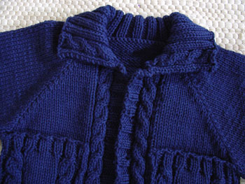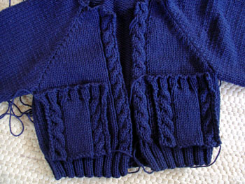 Isn't that cool? I thought that because the cables are going in opposite directions on the two fronts that the two pockets would have to be knit differently in order to match. But no, just knit the cable from the right front (when worn) on the right side of the pocket and the cable from the left front (when worn) on the left side of the pocket and it matches both sides! (I'm not very gifted when it comes to intuitive spatial reasoning, so I'm always surprised by these things.) I am sorry to report, however, that the directions didn't quite make this apparent. In fact, the pattern instructions have you reverse the cables on the pockets so they don't "match" the cables on the front. Even though the pattern picture clearly has them matching.