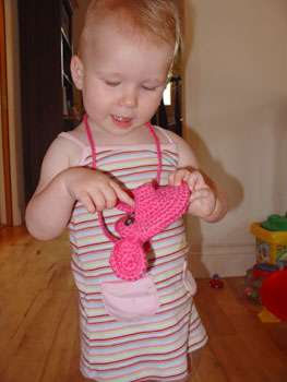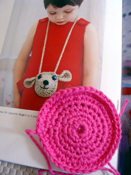 So they started crocheting. This pattern is the super cute "ted purse" from Jaeger JB-29. It's small, it's simple, it's different. And wee one loves purses. And necklaces. It's perfect for her!