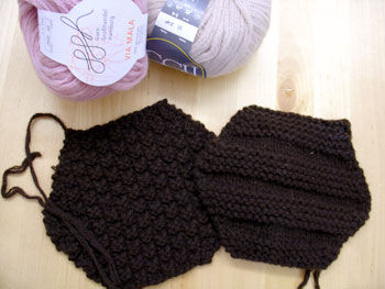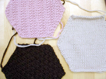Hexagon number one is in double moss stitch and number two is in a stockinette/garter stripe. Love that effect on the second one!