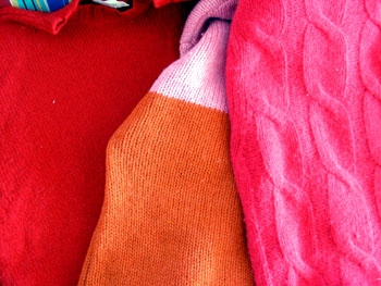 What I really loved about this pattern is its mixture of knitting and fabric. I've already pulled out these old sweaters from the closet to use for at least some of the "fabric" hexagons.