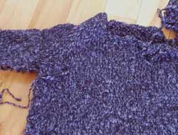 And finishing off the rip-a-thon, a little cool down exercise. Remember blue, my bumpy giboulees sweater that I knit half of using the wrong pattern? I've decided to stick with this pattern, but since I don't have enough yarn to do the big bell sleeves, I ripped out the sleeve that I'd started so I can reknit it straight. Ready for one last rip?!