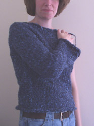 I didn't want to make this pattern. I've been planning and replanning what to do with this yarn so long that I'd forgotten my last decision. In my excitement, I cast on for this sweater (yes, the same one Kerrie was working on) and now that I'm done with about half of it, it occurs to me that I initially wanted to make this sweater. I think that's the one Kim knit that made me want the yarn so much. The image of Kim's sweater popped into my head while I was working on holiday gifts and I decided that once I was done knit-gifting I was going to pull the yarn out and get started right away. But I'd slipped a copy of the other pattern in with the yarn at some point, toying with the idea of changing the sleeves from set-in to raglan. So I got out the yarn and finding the pattern in there was impressed by my organization, and knit happily away. Now I have blue sweater with raglan sleeves and a stockinette edging, which is rolling a little too much for my tastes.
