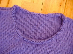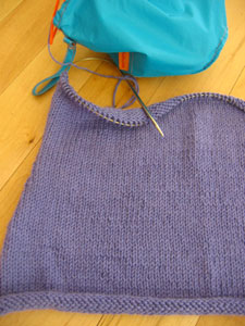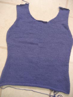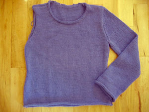 I've had no time for knitting things for myself these days, what with those socks to finish and design projects taking over all my free time. So, I don't really know how I managed to finish the front of the purple t-shirt sweater. A half hour stolen here and there really does add up, I guess.