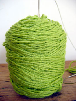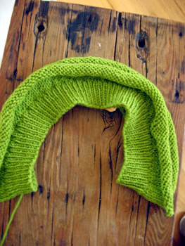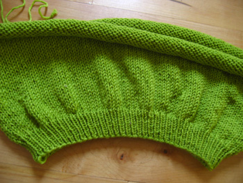 Here's about 7 inches of the body, worked in the round. Can you believe that that's just ONE skein of the Shelridge Farm worsted?! And what's really cool is that in juuuust the right lighting, you can see very subtle color variations in the green. Now I have to jot down some design notes of my work so far and do some math so I can keep knitting. Only 19 days left!