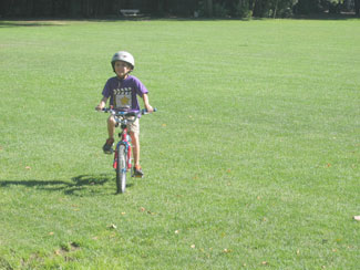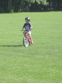 Suddenly last week, B started saying that he wanted a bicycle. I said, 'you got a bicycle for your birthday.' He said, 'nooooo, I mean one with two wheels.' I explained that the little wheels on his bike were training wheels that could come off when he was ready to ride without them. He said, 'I don't want to wait for that. I just want a bicycle now.' I think he thought the training wheels were like baby teeth or something, falling off when "it was time." I kept explaining that daddy could take them off anytime and he kept insisting that he couldn't wait. So hubby got out the wrench and voila, B gets a bike. After a couple of falls, he was off like he'd been doing it forever.