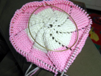 And while all the boys were out with the bikes, I was at home making friends with magic loop. It's not like we were enemies, but I hadn't ever warmed to it. I like my dpns. I like doing socks on dpns. A couple of years ago, everyone talked about the magic loop like it was some sort of great revelation. I tried it and there was no epiphany, so I went back to my dpns. As I started wee one's pinwheel jacket on dpns - it's knit in the round from the center out - it was looking like crap on a stick (well, crap on three sticks actually!). So I snuck into the (napping) baby's room to get different dpns, but in the dark all I managed to find in the right size was a long addi circular. Desperate times and all that. I gave it a shot.