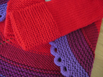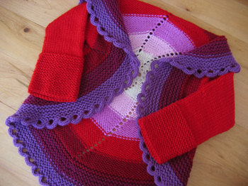 A few notes on the changes I made. After swatching, I found that I really liked the Knitpicks Swish Superwash on a US7 needle, so my gauge is a leeeetle bit smaller than called for in the pattern. The child size is supposed to go from 9 months to about 4 years, but mine fits my 6 month-old wee one great right now and should last her at least until she's two. I really like the fit that it has now and consider the gauge change a lucky accident. The second change I made was in the sleeves. I was suprised by how much I liked that garter stitch edge in the last two colors of the body of the sweater. It really transforms the circle/blanket looking thing into a proper looking jacket. So I decided to do the sleeve edging in garter stitch as well instead of in the rib called for by the pattern.