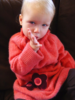 Ta da! I managed to transform that old sweater into something wee one can actually wear! I felted it several times in the washing machine until it was about the right width for a toddler dress. Next, I pulled out some pattern pieces from the Pink Fig peasant-style tops I've been making and used them to cut out the body and sleeves. I kept the side seams and hem of the original sweater, just cutting into the sweater body for the armhole openings and neck, and did the same with the sleeves, even keeping the original ribbed cuffs. This allowed me to cut off almost all of the moth holes. There was still one moth hole on the lower front, so I stitched over it several times, then added a couple of pretty felt flowers right there. For the flowers, I used leftovers from wee one's elf hat as well as Amy Karol 's clever method of creating the flower embellishments.