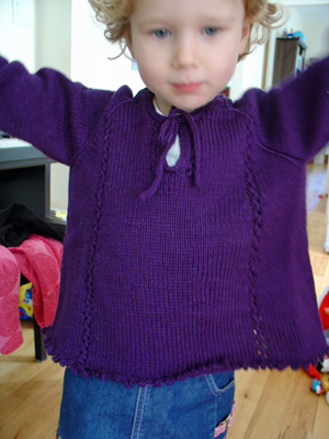 The sweater is the adorable Blossom sweater by Knitting at Knoon (knit in some fabulous purple Cascade superwash). I actually recommended this sweater to my friend years ago because its subtly lacy, slightly hippy style instantly reminded me of her daughter. Four years later and she presents me with the practically finished sweater and the same comment. And she's right - it really is my girl's style. How perfect! All I had to do was seam it up, knit the collar and ties and block those sweet little picot edges. The finally finished sweater turns out to be the exact right size and the color looks great on wee one!