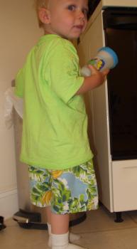 Kwik-Sew's Sewing for Toddlers knit pants in an indestructible polyester knit, fast pants made out of old t-shirts, and Kwik-Sew's Sewing for Toddlers side seam shorts made from an old shirt
