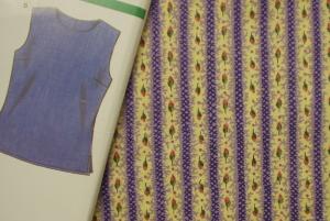 I realized I had enough of the purple striped fabric to make a skirt (one that will perfectly match my purple tank and the Phildar top when I make it). I still really liked the simple lines of the pattern I'd originally planned to use with the striped fabric, so I decided to use it with flowery fabric, which is my favorite from the new stash.
