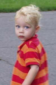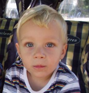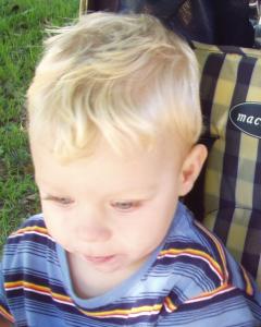 Cutting off the lace and rehemming would be pretty scary, but if it comes to that, I'll try to follow the brave example set by my boys, who got their first haircut today! They really needed it. Until April, they had almost no hair, but once it started growing in, it didn't take long for it to get a bit outta control. Here's B before and S, whose hair was even longer and curlier than his brother's.