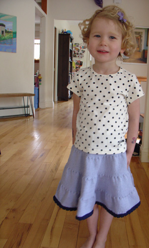 Wee one is so done with pants. She is in some ultra girly girl phase right now and pants are completely out. I've managed to get her to wear tights under her dresses in the last week, but when she wants to wear a shirt and I insist that she must wear something to cover her derriere, there's only one choice: the twirly skirt I knit her last year. So it is clear that we will be needing more of these skirts.