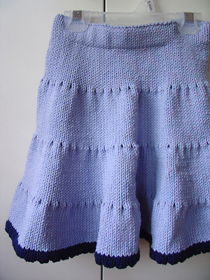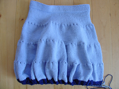 After a month of illness, I had my first full pain-free day yesterday and could finally get back to knitting wee's blue twirly skirt. Since I'd made one of these for her before, and used like seven balls of Rowan handknit dk, I was sure that my four balls of Rowan all seasons cotton would never be enough to complete the four tiers necessary to make the skirt really twirly. But as I joined the fourth ball a few rounds into the fourth tier, I began to think it would be a knitting miracle. I had already pulled out some navy handknit dk for the final tier, so when the light blue ran out just before I was to begin the picot edge, I thought it'd be perfect to trim the edge with the darker blue.
