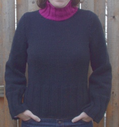 Sure I love lots of color, but a girl can always use a nice black sweater, so despite the new project push, I did a some more work on sooty mango. Here's the finished front.