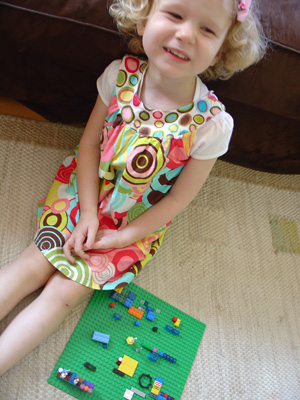 Wee one spent a half hour this morning making this little lego scene. When I asked her what everything was, she pointed out the house you go to when your car gets bumped and the other house your car gets brought to to get fixed and the house you go to to fix the bumps you get when a car bumps you. You see, we were in a car accident this weekend and, although wee is fine physically (her doctor checked her yesterday), it seems that psychologically she's got some stuff to process. Also on her little diorama: a black ring for catching oil that has spilled in the ocean. Man, does this kid have a lot on her mind!