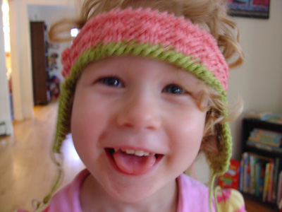I ripped out the old blue, reknit the hat and even made it through the dreaded crown shaping. (I'd read some warnings about the crown shaping in this pattern but I'm not quite sure what all the fuss was about, except that it's too big. There's a corrected version of the crown shaping posted on the Spud & Chloe website, but it just has the same instructions written out line by line. So, nothing really wrong with the instructions at all. I just skipped about 15 rounds in there so it would fit my daughter's head.)