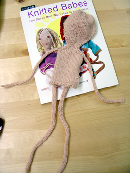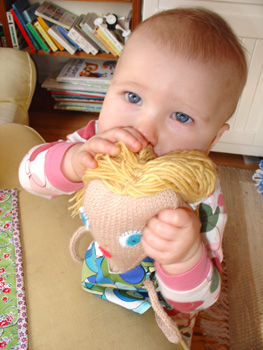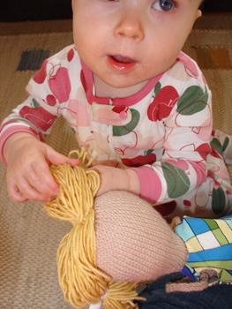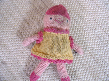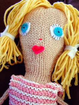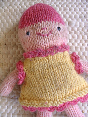 A little more than two weeks to wee one's first birthday! She certainly wouldn't notice if there weren't any presents for her, but I got it in my head to make her something. She'll have her new birthday cake hat of course, but although she likes sucking on the candle, that hat is really more for the adults' enjoyment, you know. So what would wee one really like? Perhaps another knitted dolly. She LOVES the dolly I made when we first found out I was having a girl. That and her blankie are her two must-have cuddling and thumb-sucking items. So... how about a little more grown-up doll for my little more grown up girl?