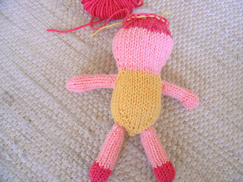 Step two (to come): make new dolly. I should have juuuust enough yarn left over from the first dolly to make a second one. Yes Virginia, you can make two dollys from one ball each of three colors of Classic Elite Bazic.