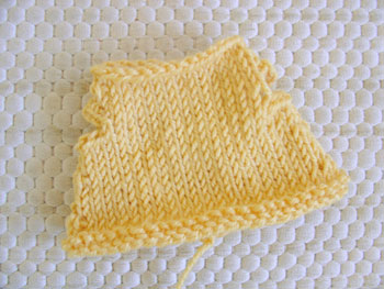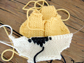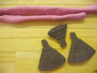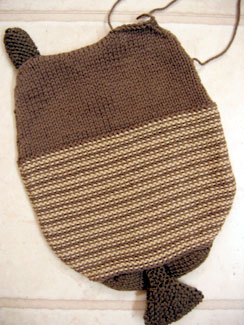 Also awaiting their continuation are the boys' lion and tiger toys. (Started last August. Progress made in January. Forgotten until now. Heh, heh. The last time I worked on and blogged about these, I joked that they probably wouldn't be done until July. Whoops. That's not going to happen.) Anyhoo, these little buggers are pretty complex, with shoe uppers and intarsia tummy patches and separate face muzzles (also with intarsia, natch). The yellow bit above is the head. That long flap folds down, then you flip it over, fold the sides in, sew the muzzle on and it's supposed to be an animal face.