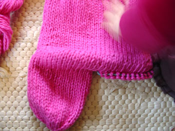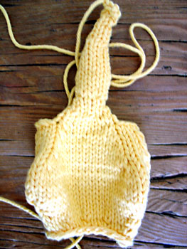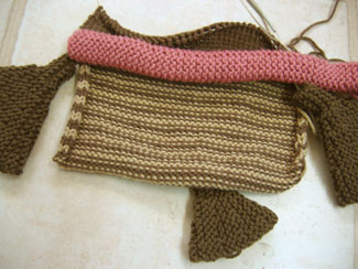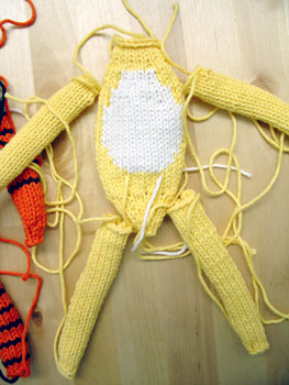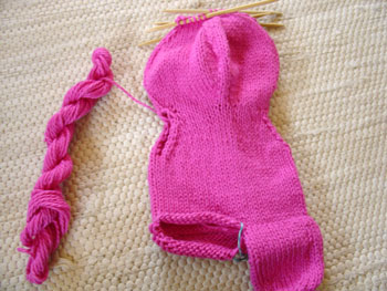 The pattern is a bit wacky. It's right enough and clear enough, but you never quite seem to know where you are or what's going on. I suspect that I'm not the only one who's felt like this because the Blue Sky folks have posted some helpful pattern clarifications on their site. A few tips from knitbuddy Terri, who has made a ton of these (here's her ravelry page), helped me see what was going on. You knit the body first in the round, then divide and do some raglan shaping to make openings where the arms go, then you flip everything around and pick up stitches to make legs, then flip back, rejoin the front and back and begin the head. See why it might be confusing?!