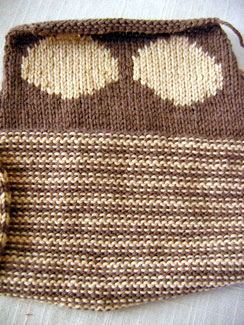 Lookie, lookie, Otto the Owl has eyes now! (Okay, all of you who have knit this pattern before, I'll admit it, I forgot to give him his nose. I know. I totally missed it on the chart. Doh! I'll go back and add it later.) Otto owes all of his progress to wee one, who did this yesterday.