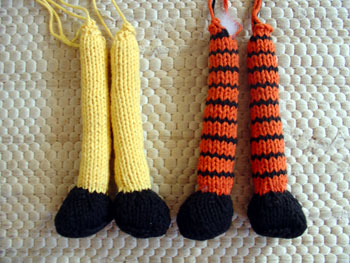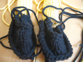 So that's legs, feet and shoes done. There's still the back, a front (with intarsia patch), two arms (thankfully, the hands are knit straight down from the arms), head (with intarsia and muzzle sections), two ears, and a tail to go. At this pace, I should have them done by the time the boys start school. Next year.