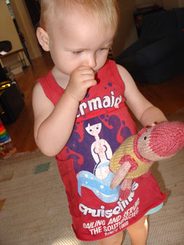 But, I can't get her away from wee one long enough to clean her. (The picture above was taken seconds after I snapped the first photo. "Hey, give me dolly back.") I think wee one and I could actually have a fun time washing dolly together, but my real worry is that she won't be able to wait until dolly is dry to get her back. So, it's looking like I'll have to knit a whole new dolly.