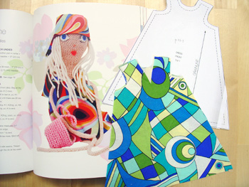 And this book is really about all the doll clothes! Sally's first dress is a striped sun dress, which I knit in some cotton glace left over from my crinkle shrug. It took forever to knit! Well, the doll was pretty quick, so I suppose it only took forever in a relative sense. But it's a lot of garter stitch and all in a fingering/sport weight yarn, so the next couple of dresses will be sewn. A psychedelic a-line dress is already cut out and ready to go.