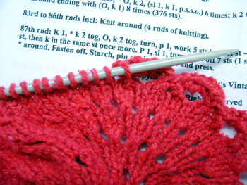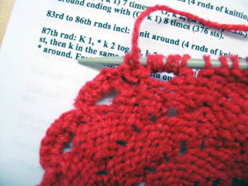 For the hemlock ring's loopy edge, better known as "87th rnd", we work four stitches and a yarnover, turn, make five new stitches in the yarnover, turn again, and bind off seven stitches. Net loss of stitches: four.