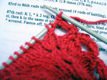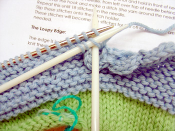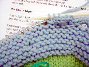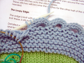 So, which do I prefer? Well, I like the big fat loops of the pinwheel's loopy edge a lot, but having dpns and the original needles all dangling about at the same time is a bit annoying. The lovely curved loops of the hemlock ring's loopy edge remind me of pretty flowery crochet edgings, but that work-turn-work-turn thing always feels a little one-step-forward-two-steps-back to me. So, I like 'em both about the same. And I'm kinda liking doing them both at the same time. When one starts to feel tedious, I switch to the other. So I don't end up completely loopy!