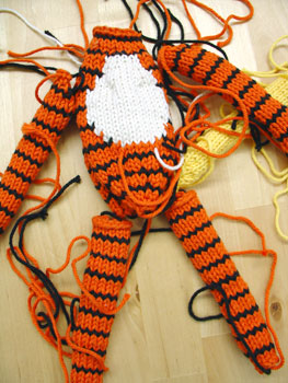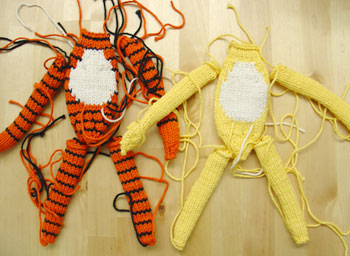 The boys' lion and tiger stuffies are finally taking shape! I decided that I'd better start seaming and stuffing before I ended up with 15 pieces and 40 ends for each animal and no desire to sew them all up. And again I am amazed at how such odd pieces can come together and look so good. (Remember the pile o' legs?!) Let's just hope the same magic works on the insane face and muzzle pieces!