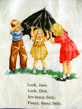 I named her Sally because it was the first name that popped into my head after I realized that "dolly" and "baby" were already taken by wee one's other dolls. Plus, the doll's floppy arms and legs instantly reminded me of the cover picture of the Silly Sally book. I also have this Dick & Jane fabric and the little girl Sally makes me think of wee one playing with her older siblings (well, if she would grow some hair!).