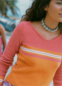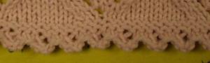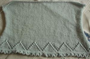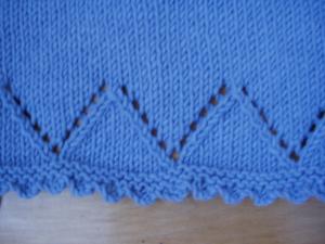 the details: Here are the v's done as written and here are some I tried out yesterday with different decreases. The second looks exactly like the picture in the book. Anne, is this how you did yours? I like them both. I think I prefer the look of the lace part in the catalog picture with less visible decreases (why would they tell us to do it differently?). I did notice, however, that several designs in Rowan's Calmer book have the same lace pattern and all those photos have the visible decrease lines under the yarnovers.