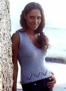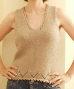 A great success, despite the pattern being a bit annoying. For those still working, or waiting to begin, here's a quick summary (with links to the archives) of all the details of my Smooch. The picot edging was done as called for (following Johanna's helpful clarifications), but I reversed the decreases on the lace pattern for a smoother look. I used my new half-twisted decrease for all the left-slanting decreases, including lace, waist shaping, and eyelets at the neck. I started the neck on the same row as the beginning of the armhole and knit just as far as necessary to complete all the neck decreases before starting the short rows for shoulder shaping. The decreases for the neck were all done on eyelet rows (to make the eyelets nice and round) except for the second and third decreases which are more frequent and make the neck more scooped than a perfect V would be. Not sure that any inquiring minds really wanted to know all that, but there it is.
